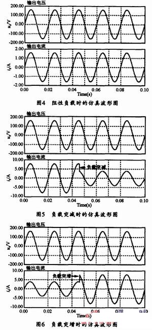 圖4給出了在輸入電壓為200V,額定負載分別為ZL=100Ω時的輸出電壓和輸出電流仿真波形;由圖4可見,輸出電壓頻率均能穩(wěn)定在50H z;圖5所示為負載突減時的仿真波形,其中突變部分是負載ZL=20Ω切換到ZL=40Ω時的輸出電壓、電流仿真波形;圖6為負載突增時的仿真波形,其中突變部分是負載ZL=40Ω切換到ZL=20Ω時的輸出電壓、電流仿真波形;通過以上仿真波形圖可知,該系統(tǒng)工作穩(wěn)定,靜態(tài)誤差小,并具有很強的魯棒型,同時,這種電流內環(huán)電壓外環(huán)的雙閉環(huán)控制的動態(tài)響應速度非常快,因此可見,用該方法對該系統(tǒng)控制電路進行設計是有效而可行的。