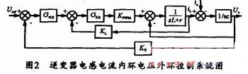 本文的雙閉環(huán)控制結構由外環(huán)電壓調節(jié)器和內環(huán)電流調節(jié)器組成。其中外環(huán)電壓調節(jié)器Gv(s)一般采用比例一積分(PI)調節(jié)器,內環(huán)電流調節(jié)器Gi(s)可以采用比例(P)調節(jié)器。圖2所示是逆變器電感電流內環(huán)電壓外環(huán)控制系統(tǒng)的結構框圖。