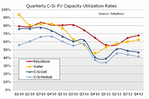 而對(duì)于一些第三季度還曾開足馬力生產(chǎn)的上游廠商來(lái)說(shuō),終端安裝量的激增并沒(méi)有全部轉(zhuǎn)化為新增訂單,出貨受阻導(dǎo)致三季度末庫(kù)存周轉(zhuǎn)天數(shù)不減反增,因此在第四季度堅(jiān)決調(diào)低了產(chǎn)能利用率。晶硅電池和組件制造環(huán)節(jié)在第四季度的平均產(chǎn)能利用率僅為四成左右,預(yù)計(jì)在2012年一季度還將維持在這一水平附近,二季度開始則會(huì)出現(xiàn)回升。