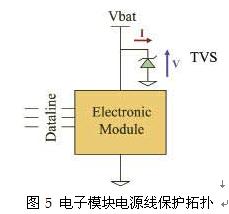 車載模塊的電源線保護是在汽車環(huán)境中需要關(guān)注的另一個問題,這個問題涉及ISO7637-2標準。例如,為滿足ISO7637-2標準,特別是圖1中的1、2、3a和3b的脈沖要求,只使用一個瞬變電壓抑制器(TVS)即可有效保護車載模塊。