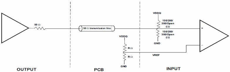 并行接口采用單端的HSTL Class1電平接口,遵循EIA/JESD8-6標準電氣指標規(guī)格,同時支持1.5V或1.8V的電源電壓。為了提高HSTL高速接口的SI性能,TLK3132并行接收側集成了可寄存器配置的匹配電阻,采用戴維南等效電路匹配方式,等效于加一個匹配電阻到VDDQ/2,同時也可關閉內部的阻抗匹配電路,如圖2所示;并行發(fā)送側可通過寄存器配置4種不同的邊沿速率。