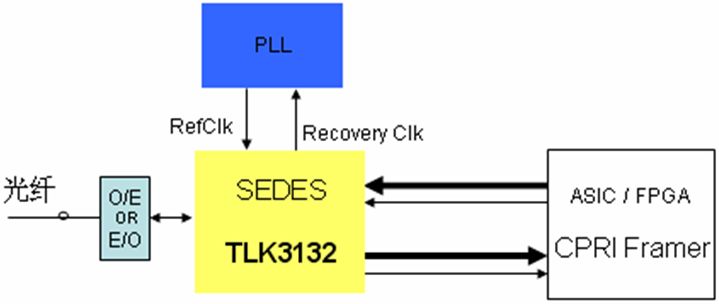 為了處理射頻模塊拉遠技術中基帶單元和射頻單元的光纖鏈接,國際上成立兩個標準化組織:一個是CPRI (Common Public Radio Interface),在2003年由華為、愛立信、NEC、西門子和北電發(fā)起成立的組織,致力于基帶、射頻接口的標準化;另一個是OBSAI (Open Base Station Architecture Initiative),由諾基亞、LG電子、三星電子等成立的聯(lián)盟。二者都定義了使基帶和射頻分離的標準化接口,也就是將宏基站分為基帶單元BBU和遠端射頻單元RRU兩部分,BBU和RRU之間傳送I/Q數(shù)據(jù)和控制管理數(shù)據(jù),其信號格式就是CPRI或者OBSAI所定義的標準接口。本文以CPRI接口為例,詳解TLK3132在射頻模塊拉遠技術中的應用。