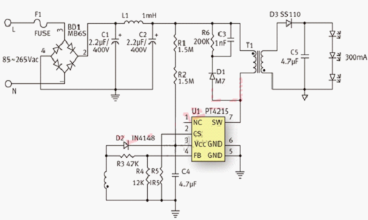 下圖是采用PT4215的3W LED燈杯的典型應(yīng)用電路。驅(qū)動(dòng)電路采用反激架構(gòu),工作在DCM模式。采用無(wú)光藕設(shè)計(jì),方案簡(jiǎn)潔可靠,成本低廉。驅(qū)動(dòng)電路能夠接受85VAC~265VAC輸入范圍,輸出電流300mA,驅(qū)動(dòng)3顆1W LED串聯(lián)的燈串。
