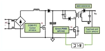 在更大功率應(yīng)用條件下,單級(jí)PFC電路難以同時(shí)兼顧PFC預(yù)調(diào)整和反激電路輸出恒流調(diào)整性能,這時(shí)需要采用兩級(jí)電路架構(gòu)實(shí)現(xiàn)這一目標(biāo)。因此,有新推出的PFC+PWM 兩級(jí)架構(gòu)電路拓?fù)浞桨福摲桨鸽娐吩韴D如圖9所示。