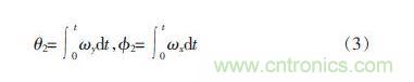 若使用陀螺儀來測量平衡車姿態(tài)角度,設(shè)陀螺儀測量載體相對慣性坐標(biāo)系的x、y、z 三軸旋轉(zhuǎn)角速度分別為ωx、ωy、 ωz。并定義0 時刻平衡車直立靜止??傻玫礁┭鼋?theta;2和橫滾角φ2估計(jì)值與ωx、ωy之間的關(guān)系如式3 所示:
