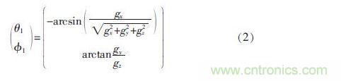 其中,Cbn為慣性坐標(biāo)系到載體坐標(biāo)系的變換矩陣;θ 為俯仰角;φ為橫滾角;g 為重力加速度; 可以通過測量重力加速度分量gx、gy、gz,計(jì)算出平衡車俯仰角θ1和橫滾角φ1估計(jì)值