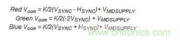 AD8147根據(jù)以下公式提供額外的特性,以編碼TTL邏輯電平、三路輸出共模電壓(VOCM)上的水平和垂直同步脈沖信號(hào):