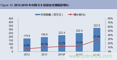 2014藍(lán)皮書(shū)還指出2013年中國(guó)信息安全市場(chǎng)總體規(guī)模為194億元,其中工業(yè)領(lǐng)域信息安全為23.28億元,占中國(guó)信息安全市場(chǎng)的12%。中國(guó)工業(yè)控制系統(tǒng)(ICS)信息安全市場(chǎng)整體規(guī)模為1.98億元,同比增長(zhǎng)10.1%,相比2012年增速提高3.3個(gè)百分點(diǎn)。
