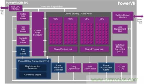 新家族的第一名成員是PowerVR GR6500,基于最新一代的四陣列移動(dòng)GPU PowerVR Rogue設(shè)計(jì)而來,整合了PowerVR Series6 XT系列的所有特性,并加入了強(qiáng)大的光線追蹤硬件加速電路。