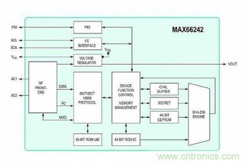 幾種功能對于無線NFC/RFID應(yīng)用非常重要:集成到無源標簽認證器的高級安全性(圖2)、集成無線NFC/RFID接口和I?C接口、數(shù)據(jù)保護模式、高速數(shù)據(jù)傳輸、標簽?zāi)芰渴占?;MAX66242集成了SHA-256加密引擎,提供基于安全密鑰的對稱式質(zhì)詢-應(yīng)答安全認證。是控制NFC/RFID讀卡器與那些設(shè)備通信,以及如何與MAX66242通信的最好途徑。32字節(jié)SRAM緩存器有利于通過I?C接口進行高速數(shù)據(jù)傳輸。標簽上的能量收集引腳VOUT使其利用天線從讀卡器的HF場收集能量。