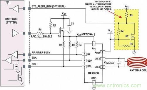 圖4. 嵌入式設(shè)計中支持NFC/RFID功能的典型電路圖。該電路與MAX66242安全認證器標簽的主要功能相結(jié)合,使嵌入式系統(tǒng)能夠支持當今便攜式以及安全、嵌入式系統(tǒng)的新型非接觸應(yīng)用。