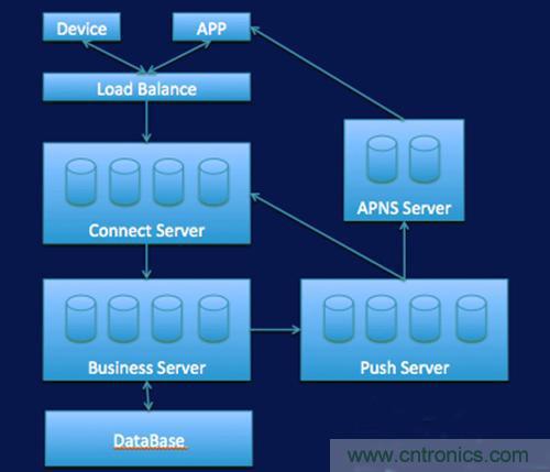 看一下最簡(jiǎn)單的IM架構(gòu),這里面要保持長(zhǎng)連接,接下來做一些業(yè)務(wù)處理,下面是存儲(chǔ),如果App要去控制Device的時(shí)候,發(fā)到業(yè)務(wù)層處理完了之后,這里面有一個(gè)推送的,可以找到Device到底連了哪一臺(tái)機(jī),然后再把數(shù)據(jù)推送過來。如果Device自己的狀態(tài)發(fā)生變化,它的數(shù)據(jù)要推送給APP,基本上是這樣的工作流。如果App是黑莓等設(shè)備的,我們可能要專門推送到APNS里面來。