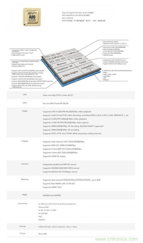 多媒體方面, H8支持多格式1080p@60fps視頻編解碼, 支持H.265/HEVC視頻處理,集成8M ISP圖像信號(hào)處理架構(gòu),可支持800萬(wàn)像素?cái)z像頭。 顯示方面,H8支持HDMI 1080p@60fps顯示,支持HDCP V1.2協(xié)議,支持HDMI CEC。此外,H8集成了全志新一代麗色顯示技術(shù),圖像顯示質(zhì)量進(jìn)一步提升。事實(shí)上,H8芯片最早是應(yīng)用于電視盒子。