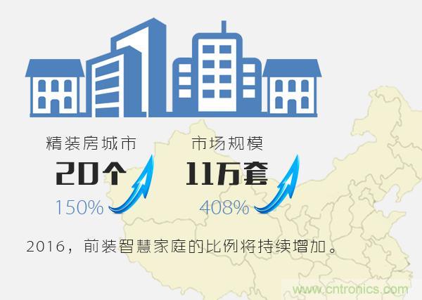 2015年各大地產(chǎn)商和物業(yè)公司都在推出智慧家庭和智慧社區(qū)的產(chǎn)品或樣板,包括花樣年、招商地產(chǎn)、金地物業(yè)、保利地產(chǎn)、萬科等。據(jù)奧維數(shù)據(jù)顯示,2015年有智能精裝房的城市達(dá)到20個(gè),同比增長150%;市場規(guī)模達(dá)到11萬套,同比增長408%。2016年面對(duì)低迷的樓市,為了維持房價(jià),商品房中前裝智慧家庭的比例還會(huì)增加。