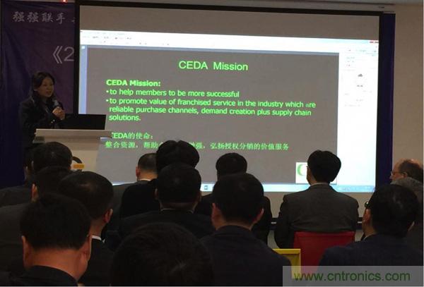 圖1:《2015中國電子授權(quán)分銷商名錄》發(fā)布會暨行業(yè)領(lǐng)袖峰會,CEDA常務(wù)理事Amy Wang介紹CEDA的使命
