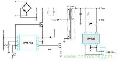 典型的手機(jī)充電器的硬件結(jié)構(gòu)(以基于Dialog方案的高通QC2.0快充協(xié)議為例)如圖 1所示。iW626作為QC2.0協(xié)議控制器,經(jīng)由USB口的D+/D-信號(hào)和手機(jī)側(cè)AP進(jìn)行供電協(xié)商,然后通過(guò)光耦控制原邊的AC/DC控制器iW1780完成輸出電壓的調(diào)整。