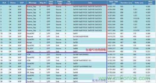 為了更加有效開(kāi)發(fā)和準(zhǔn)確驗(yàn)證基于控制流程的協(xié)議溝通,本文采用賽普拉斯研發(fā)的PD協(xié)議分析儀CY4500 EZ-PD™ Protocol Analyzer。CY4500 協(xié)議分析儀通過(guò)抓取配置通道(CC,Configuration Channel)上的數(shù)據(jù)包,并通過(guò)USB接口發(fā)送到主機(jī)端,通過(guò)軟件EZ-PD Analyzer Utility解碼并顯示PD協(xié)議包。CY4500不僅可以實(shí)時(shí)顯示并解析PD通信包,而且還實(shí)時(shí)測(cè)量電力傳輸過(guò)程中的電壓和電流值,進(jìn)而縮短了開(kāi)發(fā)周期,對(duì)于調(diào)試以及兼容性測(cè)試幫助非常大。