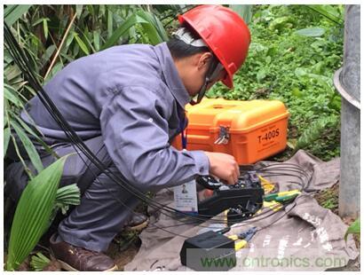 野外現(xiàn)場(chǎng)——第一時(shí)間趕到現(xiàn)場(chǎng),通過住友電工T-400S熔接機(jī)快速接續(xù)線路,保障網(wǎng)絡(luò)暢通