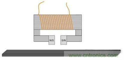 在實(shí)用化系統(tǒng)中需要用到一個(gè)寫入磁頭,它其實(shí)就是繞在磁心上的一個(gè)線圈。通過(guò)控制線圈中的電流方向可以很容易編程磁場(chǎng)方向。這有助于在磁卡上形成南北極圖案。磁極之間的空隙越窄,磁卡上能夠編程的數(shù)據(jù)密度就越高。