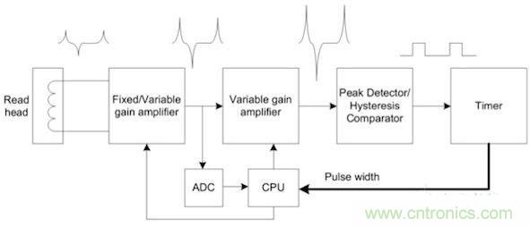 CPU讀取ADC,然后控制放大器增益。放大后的信號(hào)送到磁滯比較器產(chǎn)生邊沿接近信號(hào)峰值的數(shù)字信號(hào)。CPU隨后必須調(diào)整放大器增益,使其閾值接近峰值但不超過(guò)峰值。這有助于避免磁卡發(fā)生抖動(dòng)時(shí)出現(xiàn)定時(shí)誤差。磁滯比較器輸出則送到定時(shí)器進(jìn)行脈沖寬度測(cè)量。CPU讀取定時(shí)器輸出,并解碼為邏輯1或0的數(shù)據(jù)。當(dāng)劃卡結(jié)束時(shí),CPU打包數(shù)據(jù)比特,檢查是否有錯(cuò)誤,然后通過(guò)I2C、SPI或UART接口將數(shù)據(jù)送給主機(jī)。