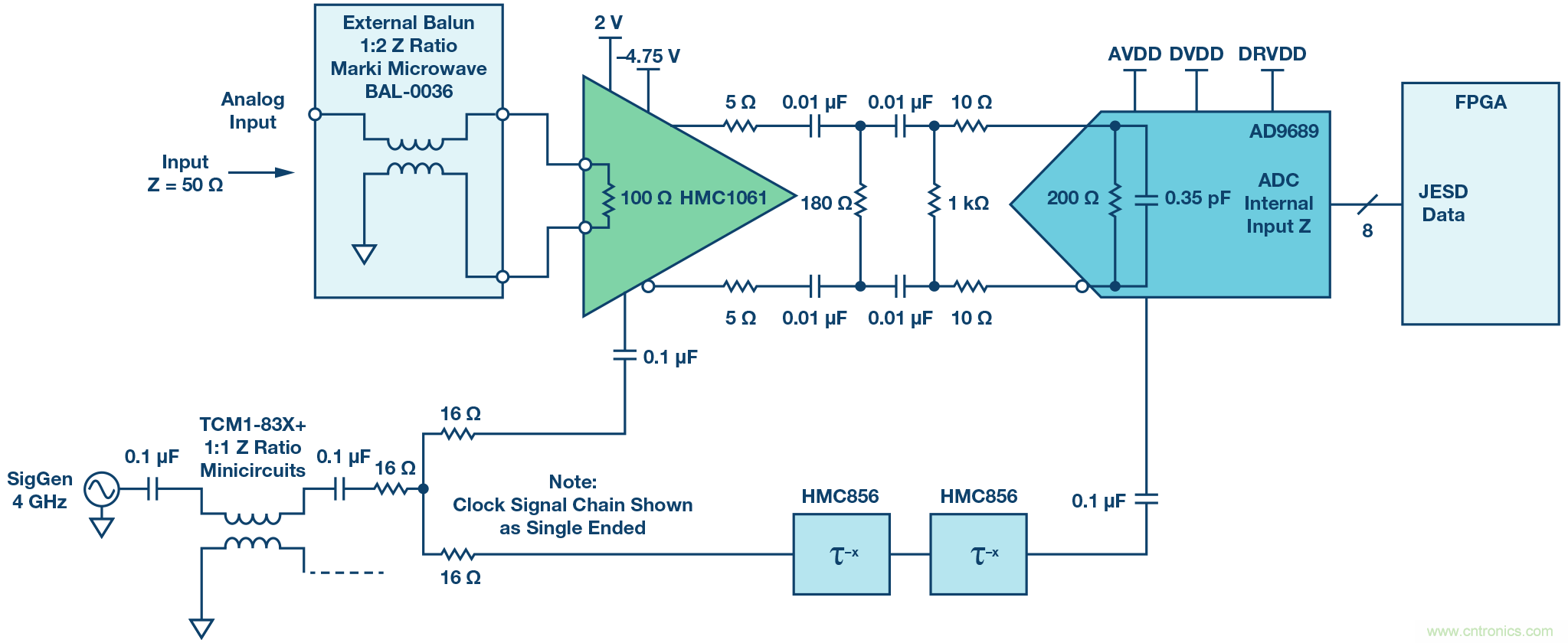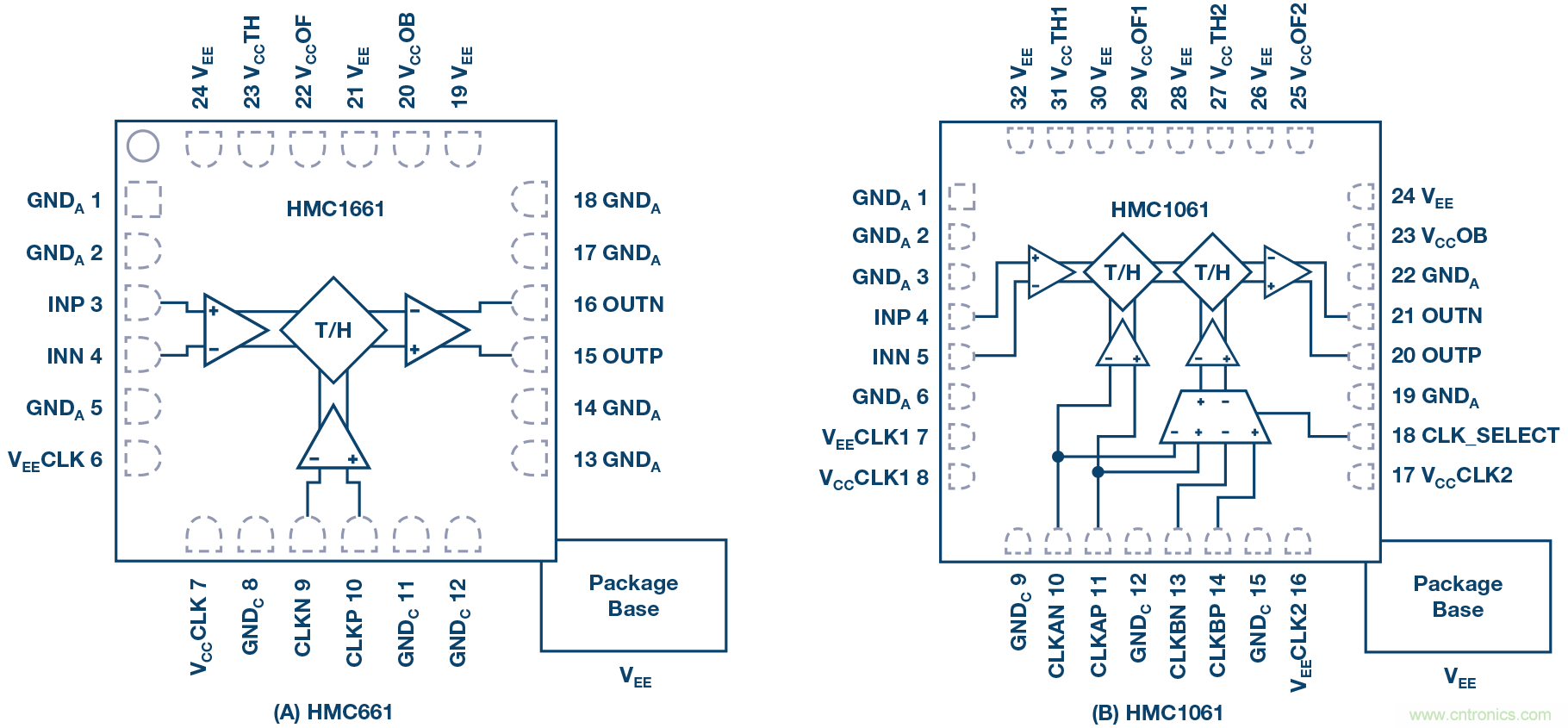 以單級THA HMC661為例,產生的輸出由兩段組成。在輸出波形(正差分時鐘電壓)的采樣模式間隔中,器件成為一個單位增益放大器,在輸入帶寬和輸出放大器帶寬的約束下,它將輸入信號復制到輸出級。在正時鐘到負時鐘躍遷時,器件以非常窄的采樣時間孔徑對輸入信號采樣,并且在負時鐘間隔內,將輸出保持在一個相對恒定的代表采樣時刻信號的值。配合ADC進行前端采樣時,常常優(yōu)先使用單級器件(ADI 同時法布里了兩級THA 的型號HMC1061),原因是多數高速ADC已經在內部集成一個THA,其帶寬通常要小得多。因此,在ADC之前增加一個THA便構成一個復合雙級組件(或一個三級組件,如果使用的是雙級HMC1061),THA在轉換器前面。采用同等技術和設計時,單級器件的線性度和噪聲性能通常優(yōu)于雙級器件,原因是單級器件的級數更少。所以,單級器件常常是配合高速ADC進行前端采樣的最佳選擇。