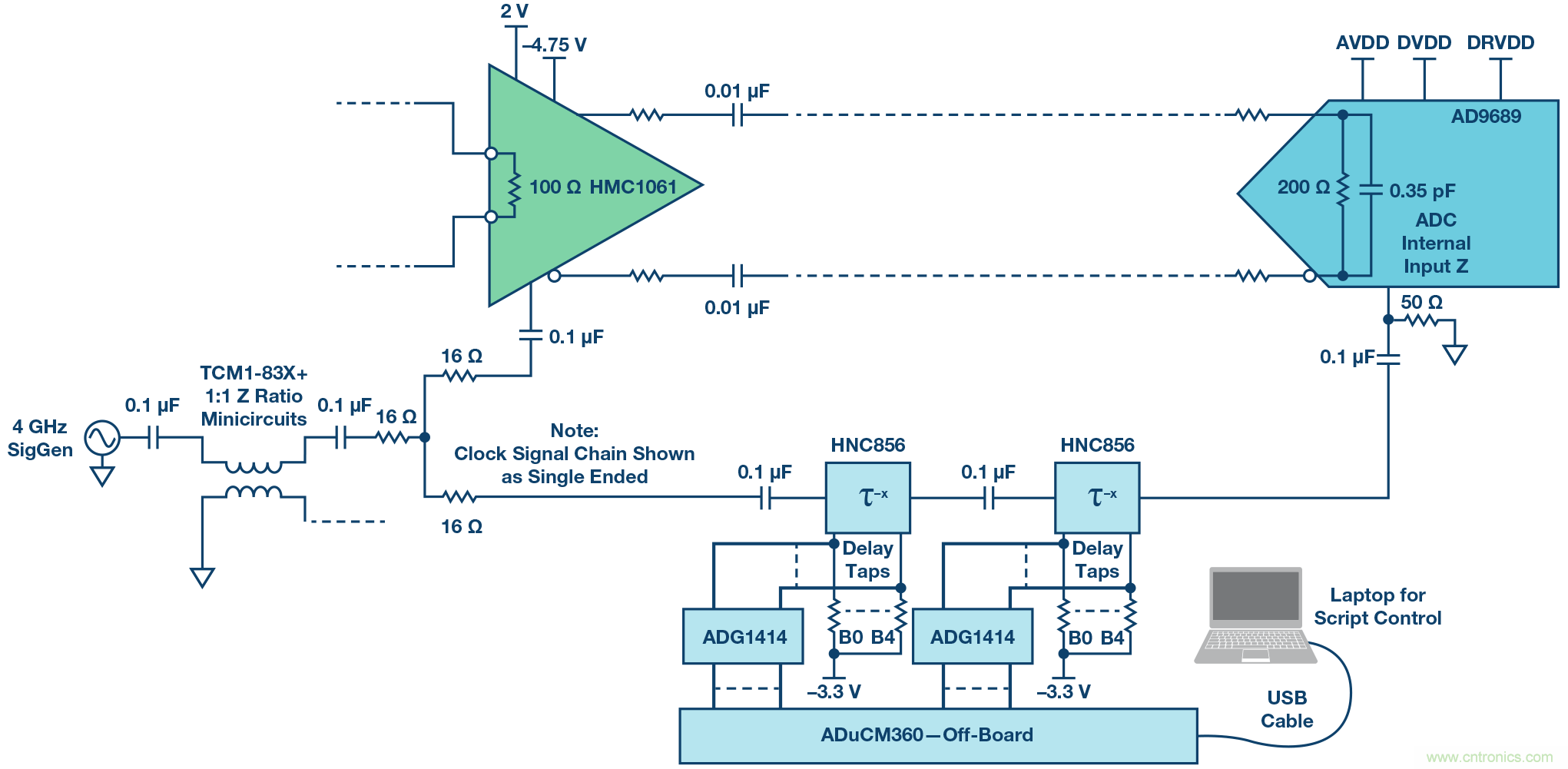 在電路板上完成該過程可能冗長乏味,因為紙面分析可能不會考慮PCB板上時鐘走線傳播間隔造成的相應延遲,內部器件組延遲,ADC孔徑延遲,以及將時鐘分為兩個不同段所涉及到的相關電路(一條時鐘走線用于THA,另一條時鐘走線用于ADC)。設置THA和ADC之間延遲的一種方法是使用可變延遲線。這些器件可以是有源或無源的,目的是正確對準THA采樣過程的時間并將其交給ADC進行采樣。這保證了ADC對THA輸出波形的穩(wěn)定保持模式部分進行采樣,從而準確表示輸入信號。