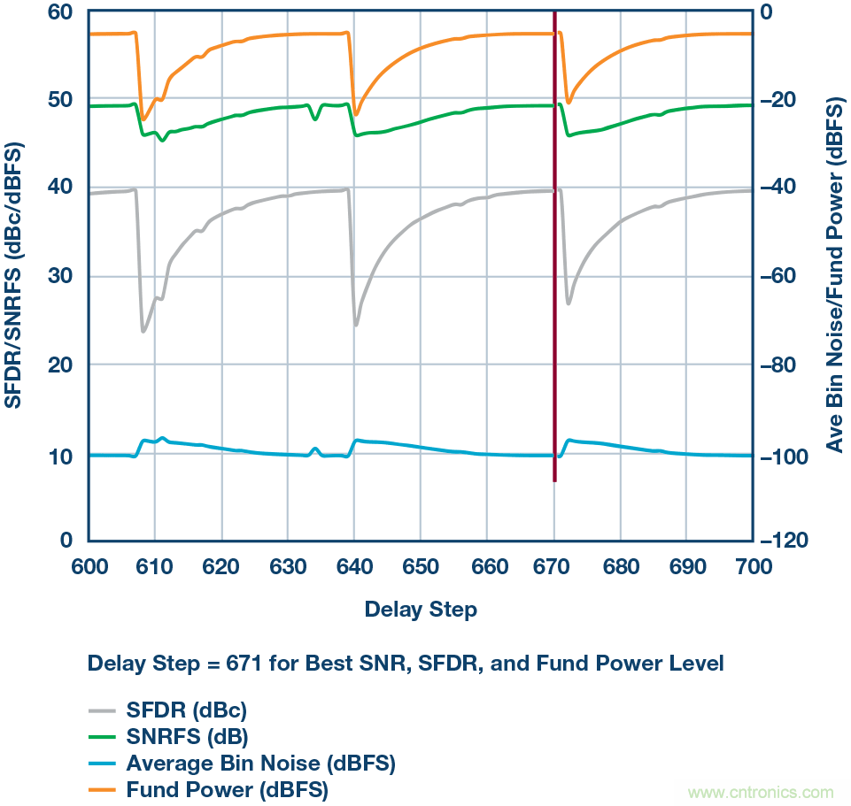 結果如圖3a所示,基波功率、SFDR和SNR將隨所應用的每個設置而變化。如圖所示,當把采樣位置放在更好的地方(THA將樣本送至ADC的過程之中)時,基波功率將處于最高水平,而SFDR應處于最佳性能(即最低)。圖3b為延遲映射掃描的放大視圖,延遲設定點為671,即延遲應該保持固定于此窗口/位置。請記住,延遲映射程序僅對系統(tǒng)的相關采樣頻率有效,如果設計需要不同的采樣時鐘,則需要重新掃描。本例中,采樣頻率為4 GHz,這是該信號鏈中使用的THA器件的最高采樣頻率。