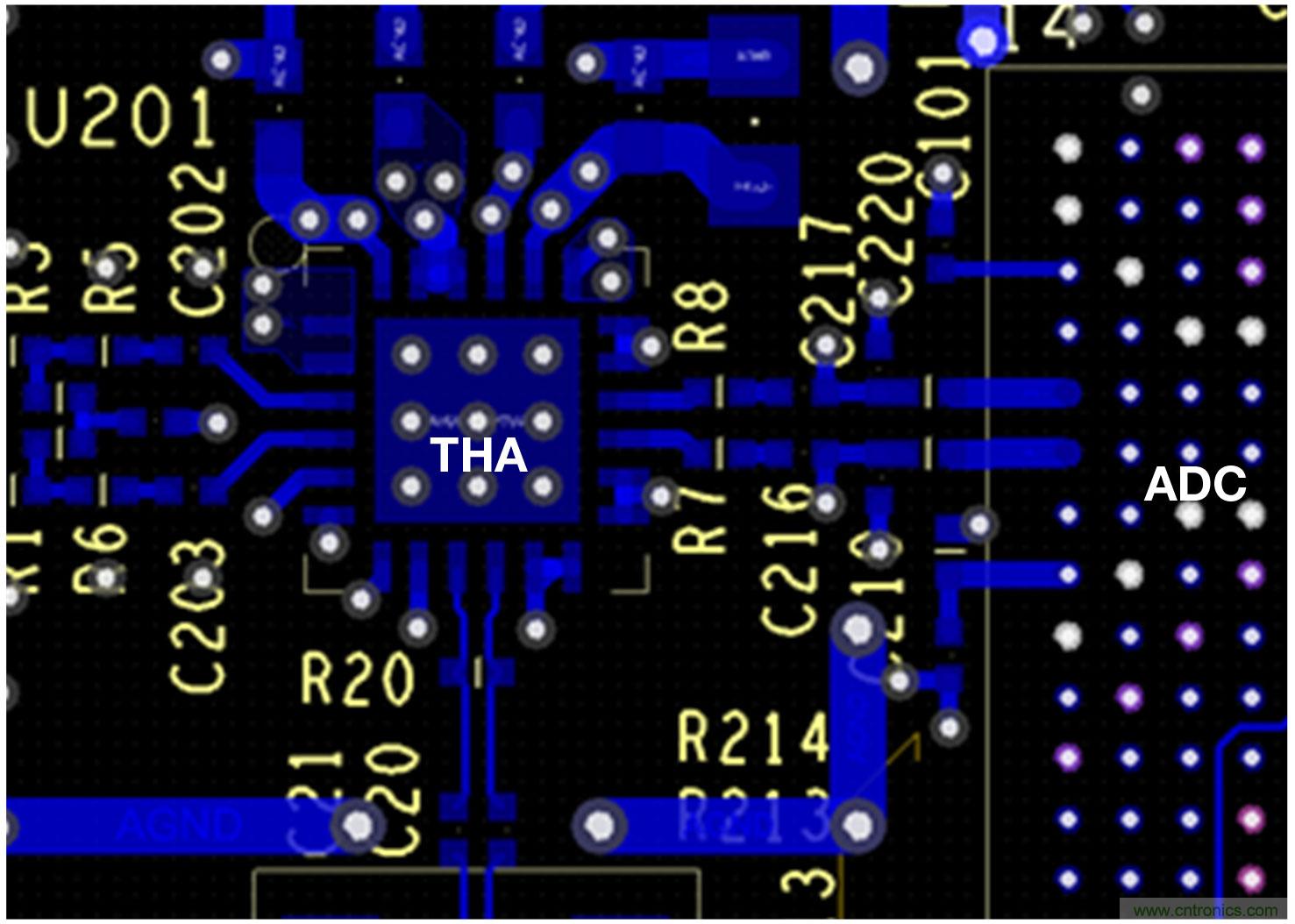 信號通過差分模式連接到THA輸入(我們同時是也提供單端射頻信號輸入的參考設計鏈路),形成單一前端網絡。為了最大限度地減少過孔數量和總長度,我們在這里特別小心,讓過孔不經過這兩條模擬輸入路徑,并且?guī)椭窒呔€連接中的任何線腳。