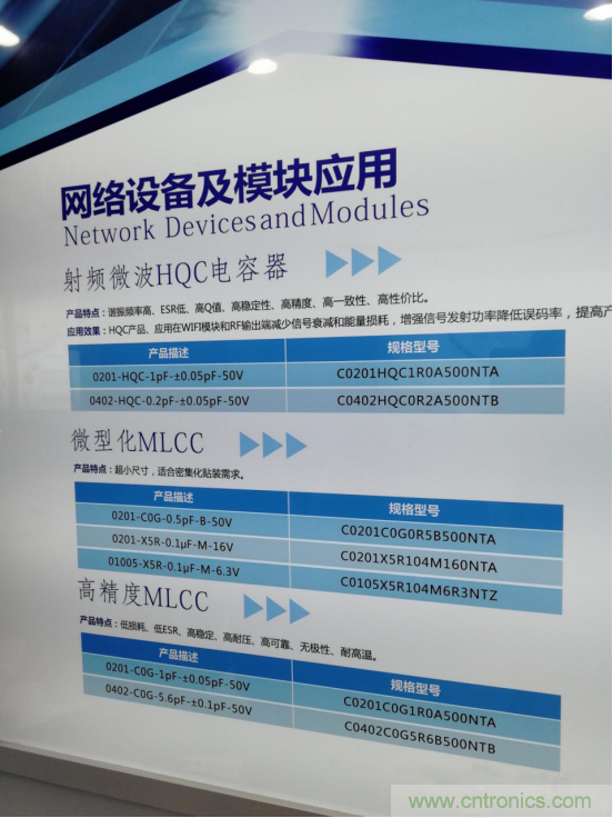 在展區(qū),宇陽科技展示了各種應用的電容,如網路設備及模塊應用射頻微波HQC電容器、手機應用中超微型MLCC、用于安防產品高溫型MLCC、用于汽車電子應用中的高容MLCC等。