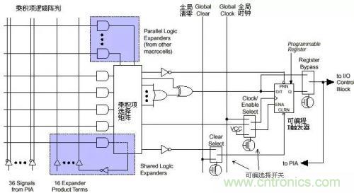 左側是乘積項陣列,實際就是一個與或陣列,每一個交叉點都是一個可編程 熔絲,如果導通就是實現“與”邏輯。后面的乘積項選擇矩陣是一個“或”陣列。兩者一起完成組合邏輯。圖右側是一個可編程D觸發(fā)器,它的時鐘,清零輸入都可 以編程選擇,可以使用專用的全局清零和全局時鐘,也可以使用內部邏輯(乘積項陣列)產生的時鐘和清零。如果不需要觸發(fā)器,也可以將此觸發(fā)器旁路,信號直接 輸給PIA或輸出到I/O腳。