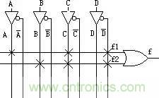 下面我們以一個簡單的電路為例,具體說明PLD是如何利用以上結構實現邏輯的,電路如下圖: