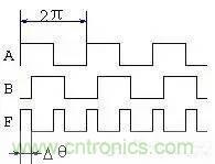 從表1可知,如果輸入端A和B分別送入占空比為50%的信號波形, 則當兩者存在相位差Dθ時,輸出端F的波形的占空比與Δθ有關(guān),見圖3。將F輸出波形通過積分器平滑,則積分器輸出波形的平均值,它同樣與Δθ有關(guān),這樣,我們就可以利用異或門來進行相位到電壓的轉(zhuǎn)換,構(gòu)成相位檢出電路。于是經(jīng)積分器積分后的平均值(直流分量)為:U = Vdd * Δ θ/π (1)