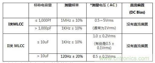 表一,I類(lèi)和II類(lèi)MLCC的測(cè)量頻率和電壓