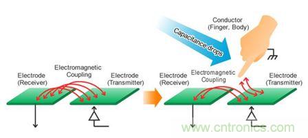 如下圖所示,在電容互感方式下,是檢測電容量的減少,來判斷按鍵是否按下。
