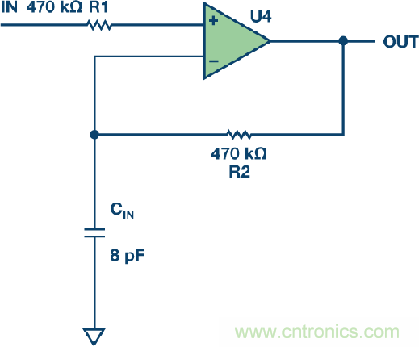 所有運(yùn)算放大器都有一定的輸入電容,包括差分和共模。如果運(yùn)算放大器連接為跟隨器,并且在反饋路徑中放入一個(gè)電阻以平衡阻抗,那么系統(tǒng)可能容易發(fā)生振蕩。原因是:大反饋電阻、運(yùn)算放大器的輸入電容和PC板上的雜散電容會(huì)形成一個(gè)RC低通濾波器(LPF)。此濾波器會(huì)引起相移,并降低閉環(huán)系統(tǒng)的相位裕量。如果降低得太多,運(yùn)算放大器就會(huì)振蕩。一位客戶在一個(gè)1 Hz Sallen-Key低通濾波器電路中使用AD8628 CMOS運(yùn)算放大器。由于轉(zhuǎn)折頻率較低,電阻和電容相當(dāng)大(參見(jiàn)圖3)。輸入電阻為470 kΩ,所以客戶在反饋路徑中放入一個(gè)470 kΩ電阻。此電阻與8 pF的輸入電容(參見(jiàn)圖4)一起提供一個(gè)42 kHz極點(diǎn)。AD8628的增益帶寬積為2 MHz,因此它在42 kHz仍有大量增益,它發(fā)生了軌到軌振蕩。把470 kΩ電阻換成0 Ω跳線即解決了問(wèn)題。因此,反饋路徑中應(yīng)避免使用大電阻。這里,何者為大取決于運(yùn)算放大器的增益帶寬。對(duì)于高頻運(yùn)算放大器,例如增益帶寬超過(guò)400 MHz的ADA4817-1,1 kΩ反饋電阻就稱(chēng)得上是大電阻。務(wù)必閱讀數(shù)據(jù)手冊(cè)以了解其中的建議。