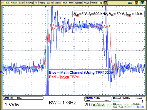 圖5顯示了對EPC9080板的高側(cè)柵-源極信號(VGS1)進行的示波器數(shù)學技術(shù)和隔離測量系統(tǒng)之間的測量結(jié)果的差異(圖1)。
