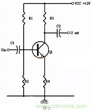 同理,當(dāng)輸入信號減小時,則Ib減小,Ic電流減小,則電阻R2的電壓U2=Ic×R2會隨之減小,Uce=VCC-U2,會變大。在輸入信減小時,Uce最大變化是從1/2的VCC變化到VCC。這樣,在輸入信號一定范圍內(nèi)發(fā)生正負變化時,Uce以1/2VCC為準(zhǔn)的話就有一個對稱的正負變化范圍,所以一般圖1靜態(tài)工作點的設(shè)置為Uce接近于電源電壓的一半。