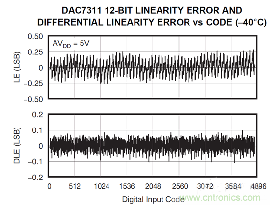 每個電阻器值的精確度可直接決定線性度。如果電阻串中任何一個電阻器的值不合適,我們就會在代碼轉換時發(fā)現(xiàn)相對于該電阻器的不良微分非線性度 (DNL)。此外,所有后續(xù)代碼的積分非線性度 (INL) 也會因為不匹配而產生失調。由于典型電阻串 DAC 設計中的電阻器數(shù)量龐大,我們不可能對每個電阻器都進行調整,因此只能接受一定程度上的 DNL 誤差。然而,仍然必須維持良好的 INL 性能,因此可經常對各組電阻器實施區(qū)域化調整,以避免調整每個電阻器,其在以下 INL 圖中呈“階梯”狀。