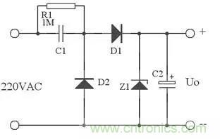 在實(shí)際應(yīng)用中,可以用下圖代替上圖,這里用了Z1正向特性和反向特性,其反向特性(也就是其穩(wěn)壓特性)來(lái)穩(wěn)定電壓,其正向特性用來(lái)在市電負(fù)半周給C1提供放電回路。