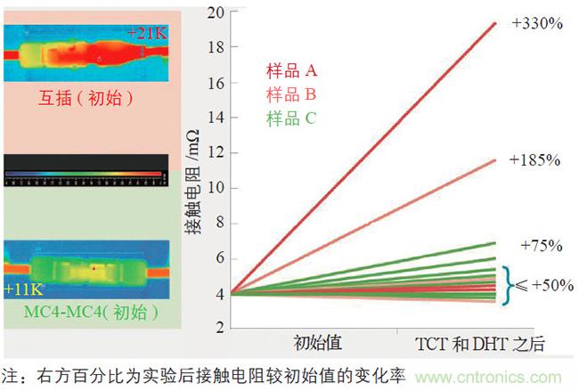 從光伏連接器的外觀和質(zhì)感可大致了解該產(chǎn)品的外形設(shè)計及絕緣材料的選擇。但是,評價光伏連接器好壞的核心指標是公母連接器對插之后的接觸電阻。一個高質(zhì)量的連接器須具有很低的接觸電阻,并能夠長期維持這種低接觸電阻狀態(tài)。根據(jù)光伏連接器最新國際標準IEC 62852,公母對插后的接觸電阻在TC200+DH1000 測試后,增量不能大于5 mΩ或者電阻終值小于初始值的150%。而這僅是最低要求,不同廠商連接器的接觸電阻值取決于制造商的技術(shù)水平。對于如何評判接觸電阻,TC400(2×TC200)和DH1000 實驗提供了一個解讀方向。圖2 為實驗比較后的結(jié)果,由圖2 可知,高質(zhì)量的光伏連接器的接觸電阻非常穩(wěn)定,這主要得益于其所使用的電連接技術(shù)。因此,客戶在選擇光伏連接器時,須對其所使用的核心技術(shù)進行全面的了解。