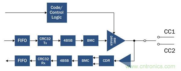 Type-C連接可正反逆插,為用戶帶來了更多的便利,卻使開發(fā)更復(fù)雜。方向通過新的配置通道(CC)管理,該配置通道在連接器上有兩個(gè)專用的引腳,并支持連接的設(shè)備協(xié)商需要提供或汲取多少電源。該通道使用的協(xié)議是一種稱為雙相符號編碼(BMC)的差分曼徹斯特編碼。USB Implementer Forum(USB-IF)定義了五個(gè)供電配置文件:10W、18W、36W、60W和100 W。使用BMC協(xié)議,電源配置文件可在含USB Type-C接口的兩臺設(shè)備之間進(jìn)行交換。編碼方案使用轉(zhuǎn)換來表示邏輯電平,而不是絕對電平,并且它結(jié)合了自己的時(shí)鐘信號,使得同步更簡單。然而,BMC協(xié)議依賴于一個(gè)物理接口,該接口能在具電氣挑戰(zhàn)的環(huán)境中可靠地解碼信號,而且很少有電氣環(huán)境比車輛環(huán)境更具挑戰(zhàn)性。