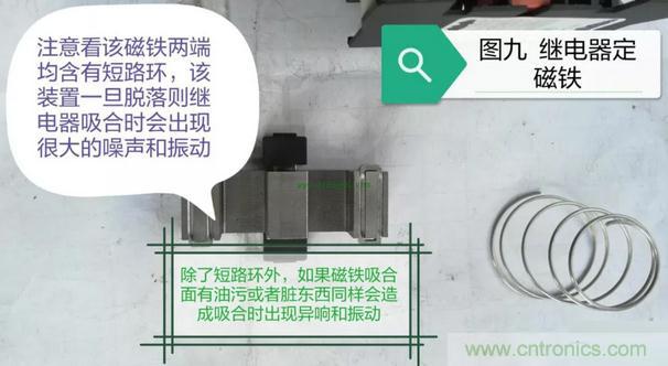 接下來(lái)我們?cè)賮?lái)看一下繼電器內(nèi)部吸合部分的構(gòu)造,在這部分當(dāng)中以固定吸合磁鐵上短路環(huán)所引發(fā)的故障最為常見,詳情請(qǐng)看圖七至圖九的展示: