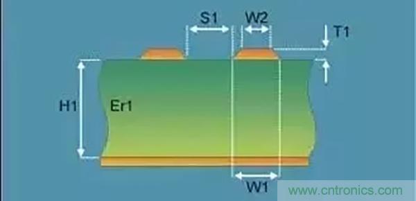 因為差分阻抗影響差分信號的眼圖、信號帶寬、信號抖動和信號線上的干擾電壓。差分線阻抗一般控制在90(±10%)歐姆(具體值參照芯片手冊指導(dǎo)),差分線阻抗與線寬W1、W2、T1成反比,與介電常數(shù)Er1成反比,與線間距S1成正比,與參考層的距離H1正比,如下圖是差分線的截面圖。