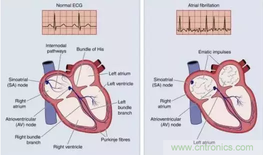 這種心律失常稱之為心房顫動(AFibrilation,AFibrilation,房顫),這是左心房和/或右心房(即心臟兩個(gè)上腔)的正常心跳異常。AFib會破壞心房和心室(即心臟的兩個(gè)下腔)之間的正常血流,并增加四至五倍中風(fēng)的風(fēng)險(xiǎn),因?yàn)樗菀仔纬裳?。事?shí)上,AFib在血管里由凝塊或脂肪斑塊沉積引起的缺血性中風(fēng)中占的比例達(dá)到15-20%。僅在美國,就有270萬和610萬人估計(jì)有AFib,預(yù)計(jì)這一數(shù)字隨著美國人口老齡化而增加,因?yàn)榧s2%的65歲以下的人和約9%的65歲以上的或更老的人患有AFib。