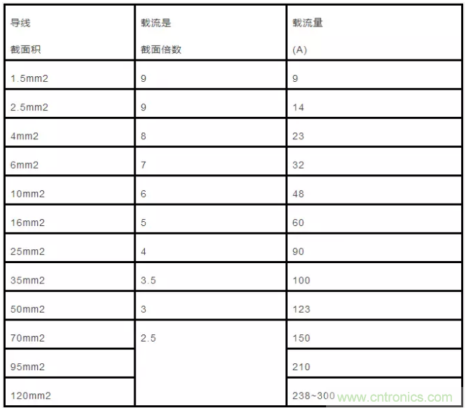 35mm”的導(dǎo)線載流量為截面數(shù)的3.5倍,即35×3.5=122.5(A)。從50mm’及以上的導(dǎo)線,其載流量與截面數(shù)之間的倍數(shù)關(guān)系變?yōu)閮蓚€(gè)兩個(gè)線號(hào)成一組,倍數(shù)依次減0.5。即50、70mm’導(dǎo)線的載流量為截面數(shù)的3倍;95、120mm”導(dǎo)線載流量是其截面積數(shù)的2.5倍,依次類推。