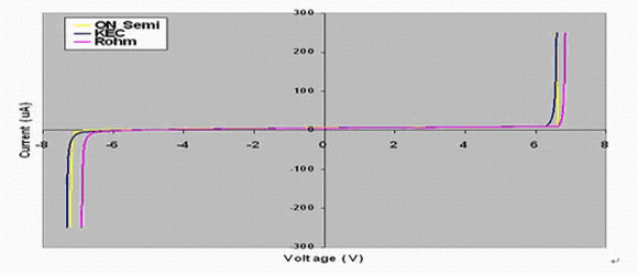 當(dāng)對以上器件的DC性能進(jìn)行比較的時(shí)候,結(jié)果看起來似乎是相同的(參見圖2所示曲線)。此外,它們都聲稱符合IEC61000-4-2第4級標(biāo)準(zhǔn),這就意味著它們將都經(jīng)受住高達(dá)8kV接觸電壓的ESD沖擊。