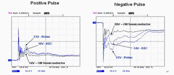 從圖3所示的圖上可見,顯然,與兩個(gè)競爭對手的器件(藍(lán)色波形)相比較,安森美半導(dǎo)體保護(hù)解決方案(黑色波形)可提供更低的ESD脈沖箝位電壓。與KEC的18V和Rohm的23V相比較,安森美的器件將正脈沖箝位在14V。而在負(fù)脈沖期間,這三個(gè)器件之間箝位電壓的差異更加明顯。安森美、競爭對手2和競爭對手1的器件對負(fù)脈沖的箝位電壓分別是20V、34V和42V。在負(fù)ESD期間這三種器件之間有明顯的區(qū)別,競爭對手2的器件的箝位電壓比安森美的器件高70%,而競爭對手1的器件的箝位電壓則是安森美器件的兩倍之多。通過競爭對手的保護(hù)器件后的剩余負(fù)脈沖電壓對那些更容易受到ESD破壞的新IC設(shè)計(jì)有潛在的危險(xiǎn)。然而,安森美的器件卻能在負(fù)脈沖和正脈沖兩個(gè)方向上保持低的箝位電壓,從而將遭受正/負(fù)ESD脈沖的破壞風(fēng)險(xiǎn)都保持在最低水平。