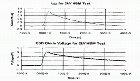大電流在ESD二極管和引線上產(chǎn)生I-R壓降,該電壓高于二極管本身的壓降。IC可靠性報(bào)告中給出了器件設(shè)計(jì)所能承受的ESD測試電壓。