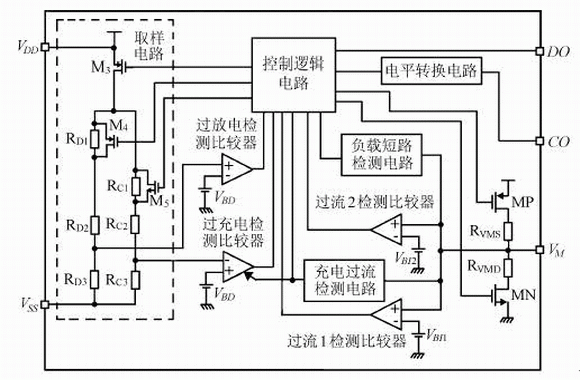 鋰離子電池保護(hù)電路為了實現(xiàn)其基本功能,首先需要檢測異?,F(xiàn)象。過充電和過放電檢測是將電池電壓進(jìn)行分壓(采樣)后與基準(zhǔn)電壓比較實現(xiàn)的;而對于過流檢測,保護(hù)芯片首先將充放電過程中的電流轉(zhuǎn)化為在功率管FET1、FET2上的電壓,然后通過VM與基準(zhǔn)電壓比較完成,放電過流檢測的是正電壓,充電過流檢測的是負(fù)電壓。