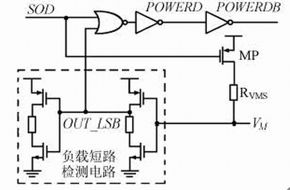 圖4 中SOD為過放電檢測信號,系統(tǒng)處于正常狀態(tài)時,SOD為高電平,VM為低電平,因此待機(jī)狀態(tài)控制信號POWERD輸出高電平、POWERDB輸出低電平。當(dāng)系統(tǒng)進(jìn)入過放電狀態(tài)時,SOD(延時后的信號)變?yōu)榈碗娖?,MP導(dǎo)通使VM變?yōu)楦唠娖?,最終使POWERD變?yōu)榈碗娖健OWERDB變?yōu)楦唠娖?,它們控制保護(hù)電路相應(yīng)模塊停止工作,系統(tǒng)進(jìn)入待機(jī)狀態(tài)。當(dāng)對電池進(jìn)行充電時,由圖1可知VM被強制拉到低電平,使負(fù)載短路檢測電路的輸出信號OUT_LSB變?yōu)楦唠娖?;此時,不論SOD為何值或非門都將輸出低電平,POWERD由此變?yōu)楦唠娖?,這樣,就可實現(xiàn)待機(jī)狀態(tài)的退出。